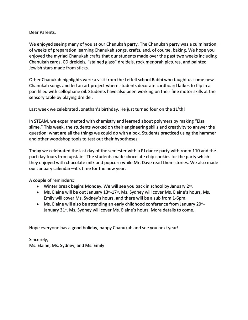 - Your role: Interview co-teachers about activities in the past two weeks and compose a newsletter to send to parents for Montessori-style program .